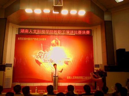 为隆重纪念中国共产党成立90周年,重温党的光辉历程,歌颂党的丰功伟绩,2011年5月24日下午三点在匠成楼报告厅隆重举行了由校工会主办的“党在我心中”教职工演讲比赛决赛,出席本次比赛的嘉宾有校长郭军,党委副书记李尚益,副校长刘和云、刘铁铭、蒋建初、石潇纯、周发明,纪委书记李凤莲,副校级督导邓和秋、李高海等。校长郭军为本次比赛致辞。