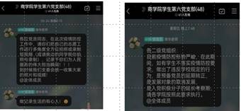 商学院学生第六党支部书记郑清华老师将习近平总书记的重要讲话及学校党委的疫情决策相关部署文件转发至学习强国、微信、QQ等平台的党员群并同各位党员同志展开深入交流。
