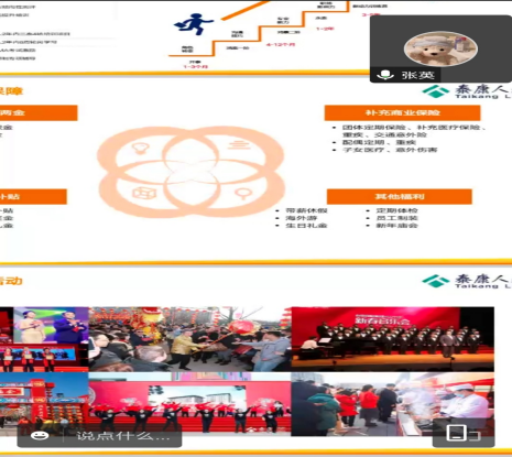 2022年10月25日晚,商学院在高韵楼211召开了泰康人寿线上专场招聘会,泰康人寿人事张经理、就业专干黄鹍鹏以及19级的应届毕业生参加了本次招聘会。