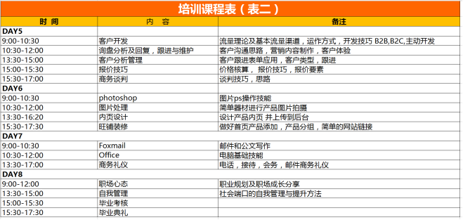 同时,根据课程培训体系,制定了具体的课程培训表,如下表所示: