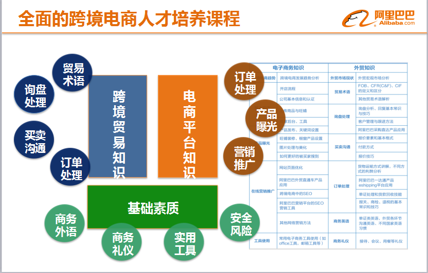 我院于2016年11月份与阿里巴巴签署了“百城千校 百万英才”跨境电商人才培训基地项目。2017年5月,我院与阿里巴巴的第三方服务商杭州赛课公司共同建设了与行业、企业岗位对接的跨境电商人才课程资源包,其培养课程培训体系如下图所示: