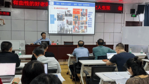 报告中,曾敏从“当前教育的问题”“当前学生的问题”的思考开始,引出百年前娄底近代教育史上享有“北有行知,南有陶龛”盛誉的、由湘军名将罗信南之孙罗辀重创建的陶龛学校。在观看视频《百年陶龛“血性”长歌》后,曾敏讲述了自己与陶龛学校的相识过程,介绍了罗辀重及其生平、历史地位、教育思想。曾敏指出,罗辀重以“血性”作为陶龛学校的校训,作为“唯一教人教己”的方针,并将血性阐释为“信义”;血性教育的真谛,在于把人类的同情心、真性情与理智融合为一,使多数人成为正气磅礴、生机盎然、有光有热有血有泪的人。他认为,罗辀重坚持教育者应秉持“服务之人生观”,才能“乐业”,并将“群育”作为学生教育的重中之重,培养学生的“合群”能力,防止个人主义,对现在的学校教育、家庭教育有重要借鉴价值。曾敏倡议,老师要有足够的文化自觉、文化远见,扛起弘扬血性教育思想的责任,坚持“为党育人、为国育才”,在“立德树人”的根上用力;践行服务之人生观:不将“钱多事少离家近”当作人生追求,用心地做到为学生服务、为同事服务、为家人服务、为大众服务;长养自己的血性,培养有血性的学生,在工作生活中践行血性教育思想,做到知行合一。