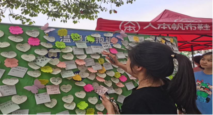 第二部分,记录温暖、留下祝愿”活动。同学用便写下心中的美好祝愿近期的困扰感恩的话语,并将其贴在温暖的抱抱展板上同学们留下了“国士无双,袁爷爷走好”、“平安喜乐”、“学业有成,天天开心”所求皆如愿300多条温暖的寄语。