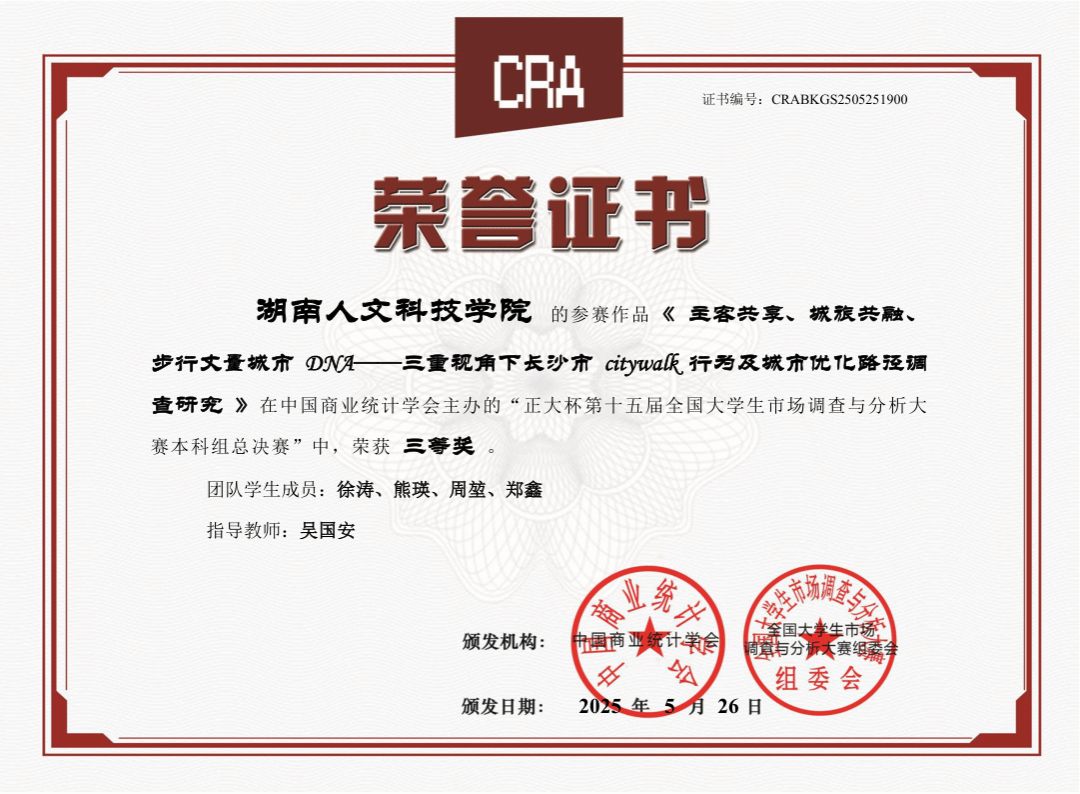 近日,“正大杯”第十五届全国大学生市场调查与分析大赛本科组总决赛在浙江财经大学圆满落幕。由商学院吴国安老师指导,徐涛等同学的作品《主客共享、城旅共融、步行丈量城市DNA——三重视角下长沙市citywalk行为及城市优化路径调查研究》荣获省级一等奖、国赛三等奖。在此届赛事中,beat365共获得省级一等奖6项、二等奖3项、三等奖2项。