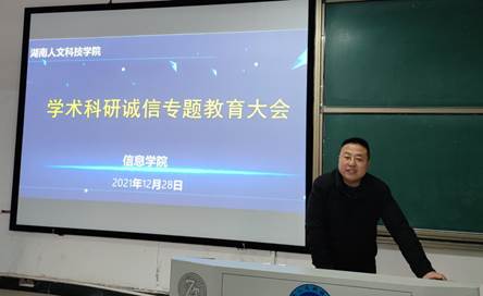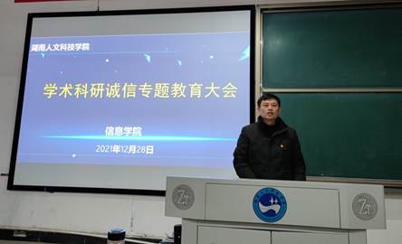 会上,谭甲凡书记首先介绍学校组织教师科研诚信教育的重要性,并要求全体教师要倡导积极向上的学术风气、恪守学术道德。唐淑红副院长带领全体教职工对国家和省级科研诚信文件进行学习,重点对《湖南省科技创新计划科研失信行为记录与惩戒暂行规定》、《高等学校预防与处理学术不端行为办法(教育部令第40号)》等文件进行了解读。随后,刘浩院长对学术科研诚信问题进行强调,并通过引用了一些发生在我们身边的学术不端典型案例来告诫大家对待学术要怀有敬畏之心,要遵守学术规范,摒弃学术不端行为,营造良好的学术研究氛围。