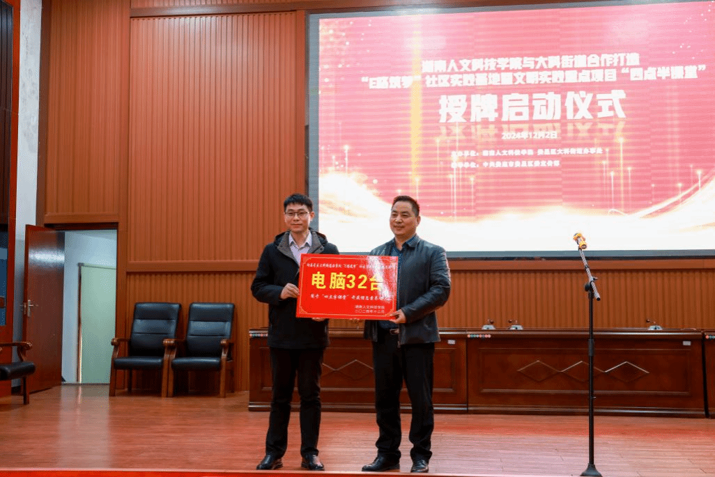 随后,大科街道党工委书记李华与beat365正版唯一官网必一信息学院党总支书记刘凤龙共同为“E路筑梦”社区实践服务基地揭牌。在仪式上,beat365正版唯一官网必一党委委员、副校长谭峰亮代表beat365正版唯一官网必一为“E路筑梦”社区实践服务基地捐赠电脑32台,以支持社区信息化建设和“四点半课堂”信息素养课程的教学活动。