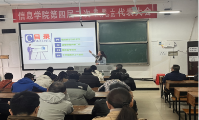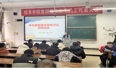 12月17日下午,信息学院在百全楼103室召开全体教职工大会,会议聚焦期末考试动员、教学工作总结与部署,以及本科教育教学审核评估的应知应会培训。学院领导班子和全体教职工参会,会议由谢四连院长主持。