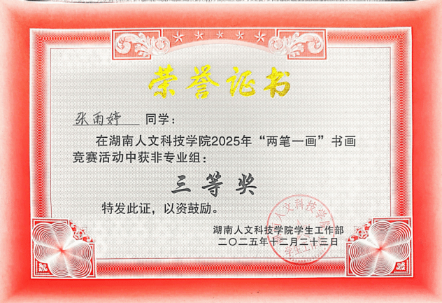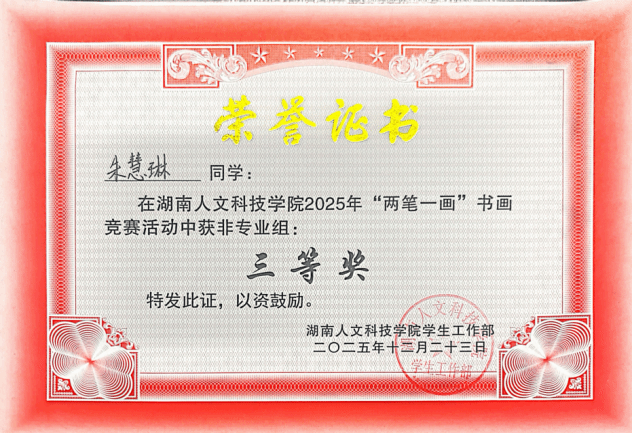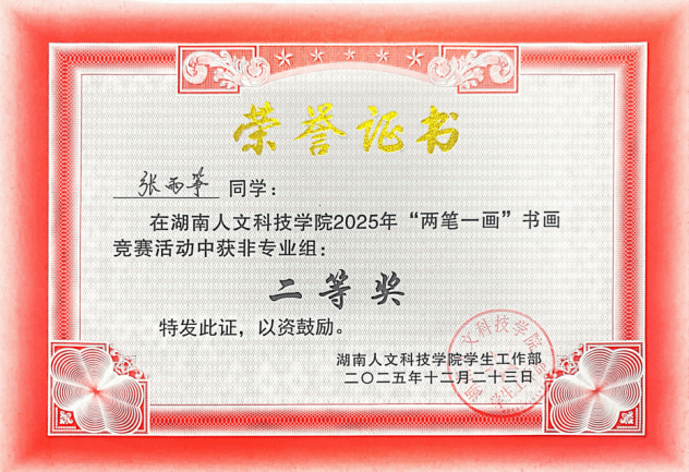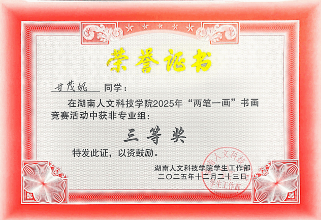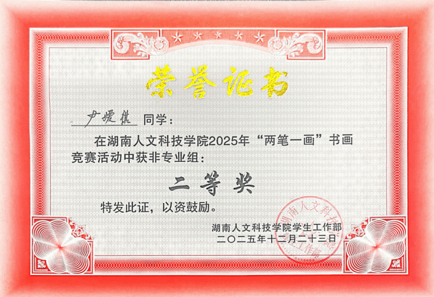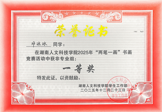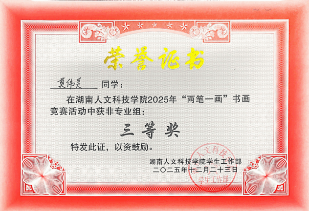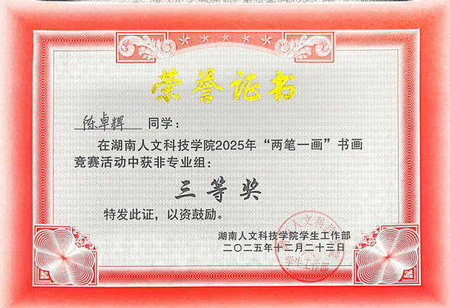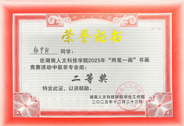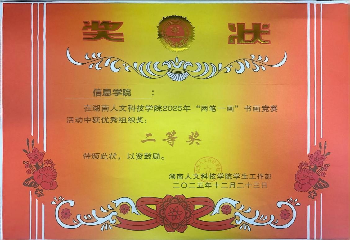 近日,beat365正版唯一官网必一2025年“两笔一画”书画竞赛圆满结束。信息学院在本次比赛中组织有力、表现突出,荣获“优秀组织奖二等奖”。与此同时,我院学子在非专业组竞赛中亦脱颖而出,斩获多项个人奖项,充分展现了深厚的艺术素养与创作才华。他们以笔墨勾勒灵感,用作品凝聚匠心,为学院赢得了荣誉与光彩。