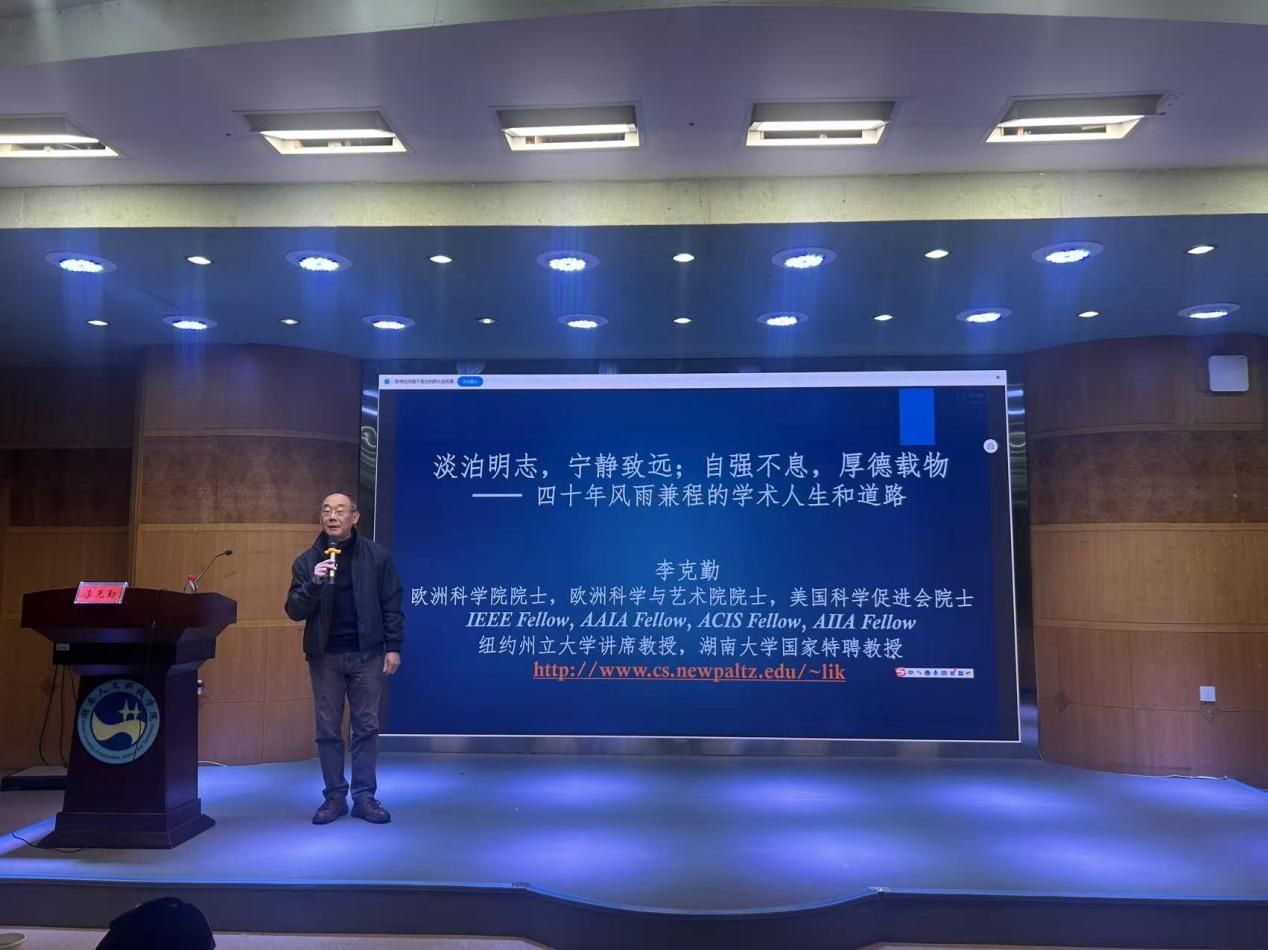 1月6日下午,欧洲科学院院士、欧洲科学与艺术院院士、美国科学促进会院士、IEEE Fellow、AAIA Fellow、ACIS Fellow、AIIA Fellow、纽约州立大学杰出学院院士、纽约州立大学终身讲席教授、中组部和人社部国家特聘专家、湖南大学信息科学与工程学院国家特聘教授、李克勤院士在养根楼报告厅作了题为《淡泊明志,宁静致远;自强不息,厚德载物——四十年风雨兼程的学术人生和道路》的学术大讲坛。讲坛由信息学院院长谢四连主持,学校副校长张细政、信息学院党总支书记刘凤龙及院领导、信息学院全体教师等聆听了报告。