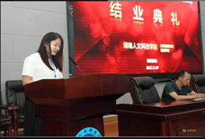 新化县文田镇中心学校的袁凯璇老师作为学员代表发表了结业感言:在这里,我们享受到了人文领导宾至如归的礼遇;我们感受到了人文教授的博学多才;我们领略到了人文校园的人文魅力。在这里,学员以研会友,肝胆相照。这是一场知识的饕餮大餐,更是一次铭心的研修之旅。作为教师的我们,聚是一团火,散是满天星!我们也将用我们最大的热情,宽容去对待我们的学生。