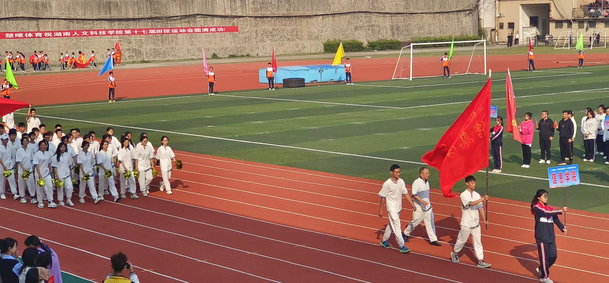 开幕式上,副校长刘建勋对运动会相关工作进行了说明,党委书记刘铁铭对运动会的召开表示热烈祝贺,运动员代表和裁判员代表分别进行宣誓,为确保运动员的后续工作有序进行做出了准备。伴随着运动员进行曲,各院代表队陆续进场接受检阅。迈着铿锵有力的步伐,喊着振奋人心的口号,身着白色运动服的信息学院代表队英姿勃发。他们手持红旗,如矫兔般飞离起点,像利箭般冲向前方,五星红旗迎风飘扬,惊艳四座;接着他们与我院特色“机器人”一起给大家带来了一支活力四射的舞蹈,他们朝气蓬勃,尽显信院人的风貌。