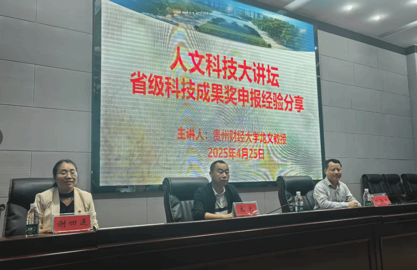 4月25日下午,贵州财经大学龙文教授做客“人文科技大讲坛”,学院师生带来题为“省级科技成果奖申报经验分享”的讲座,学院部分师生参加,讲座由院长谢四连主持。