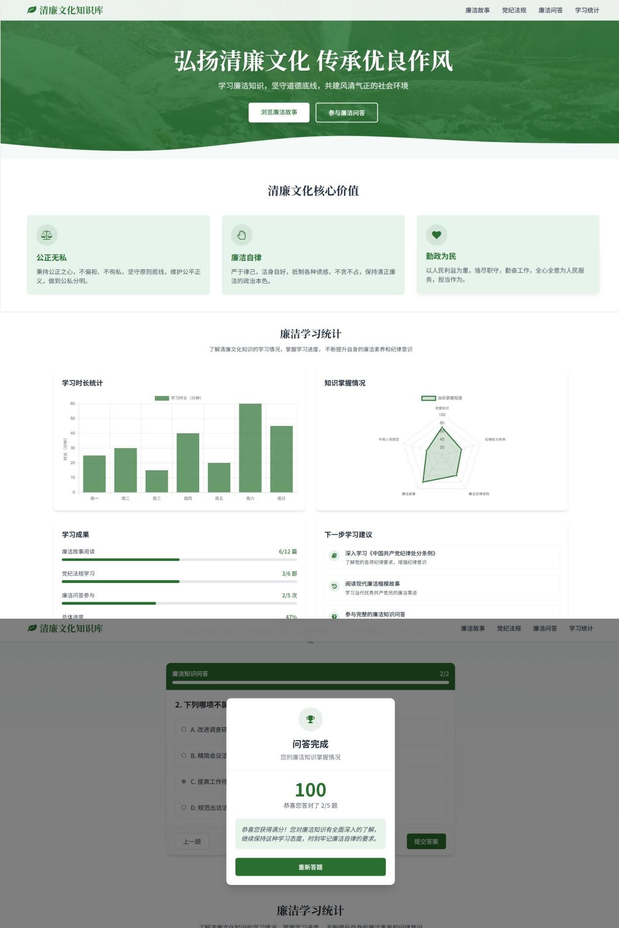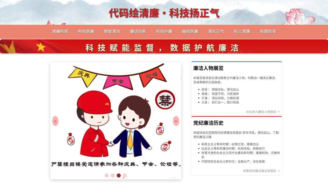 本次活动是学院将全面从严治党要求与学科特色深度融合的创新实践,旨在引导师生通过专业所学,为廉洁文化建设注入鲜活的科技动能,营造风清气正的校园环境。大赛紧扣时代主题,鼓励师生聚焦廉洁典型、挖掘身边的廉洁元素,创作一批具有深刻教育意义和时代特征的廉洁创意作品。各参赛者运用网页应用、数据可视化、AI图形生成及算法模拟等前沿信息技术,将抽象的廉洁理念转化为生动的交互网站、动态图表、主题海报和模拟程序,使廉洁教育在数字世界中变得可感、可知、可互动,充分展现了“科技+廉政”的独特魅力与创新活力。本次大赛面向信息学院全体师生,现已圆满结束,并评选出一等奖2名、二等奖3名、三等奖4名。