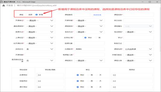选中左上角的【新增】按钮后,补充完整各项开课信息,将课程编号输入上去。注意:课程信息一定要填写完善,以免之后进行开课安排时不必要的修改操作。【课程编号】按学校实际编号手动输入(参照2019版人才培养方案。新开设的课程由教务处提供课程编号。)不要点击自动生成。课程信息补充完整后,选中【上课专业】以及【上课年级】点击【右移箭头】将信息置入已设置值中。置入的信息有误,则选择已经置入的数据然后点击【左移箭头】将这些数据从已设置的值中移除。