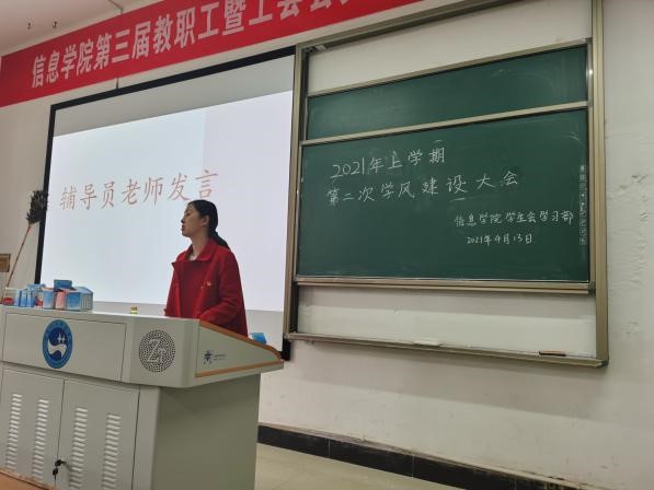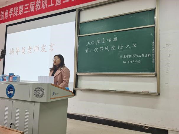 为更好地让学生们熟悉学风,加强班级班风建设,信息学院学习会学习部于4月13日中午在百全楼103举办了本学期第二次学风建设大会。参会人员包括教务办老师蔡伟华,学工办老师朱舒腊、袁微,19、20级各班班长学委,学习部干事以及迟到旷课扣分达到四分以上的同学等。