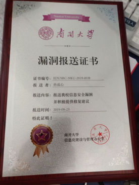2019年8月23日,孙成心做了一个重大的决定,他报送了南开大学的信息安全漏洞,不仅简单的报送,他又积极提供了修复建议。孙成心的责任心让我们这些同在人文的学子所为之惊叹,他的专业水平更是让我们所钦佩。据孙成心的朋友和同学介绍到,孙成心是一个对自己要求十分严格的人,无论是是在学习中,还是在生活中。在学习上,他认真刻苦,勤于讨论,苦于钻研,在生活中,他作息规律,坚持锻炼。他是我们在学习中的标兵,在生活中的榜样。他的闪光点就好比满天的繁星,数不胜数,每一颗都在散发着自己独特的光芒,让我们为之吸引为之动容!