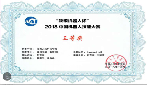 近日,为了提高大学生对人工智能的兴趣、增强大学生科技软实力,由中国人工智能学会主办、软银机器人公司协办的“软银机器人杯”2018中国机器人技能大赛暨智能检测与运动控制论坛在江苏省泰州市举行。beat365信息学院参赛团队I saw red ball在彭东海、刘刚常老的指导下,获得了高尔夫高校组三等奖的优秀成绩。