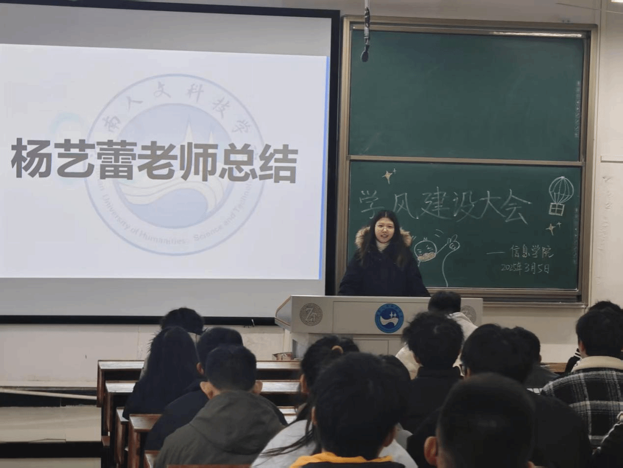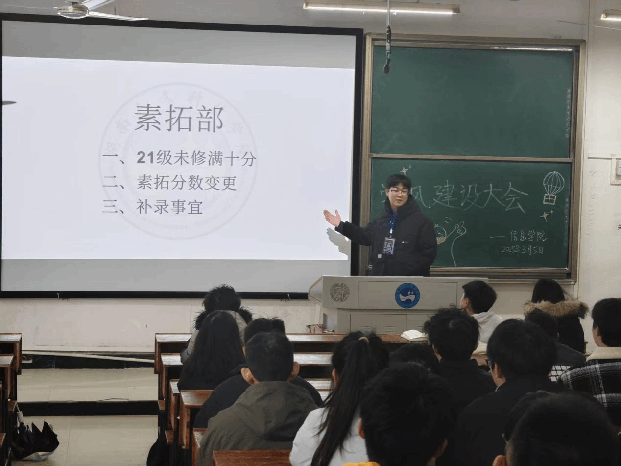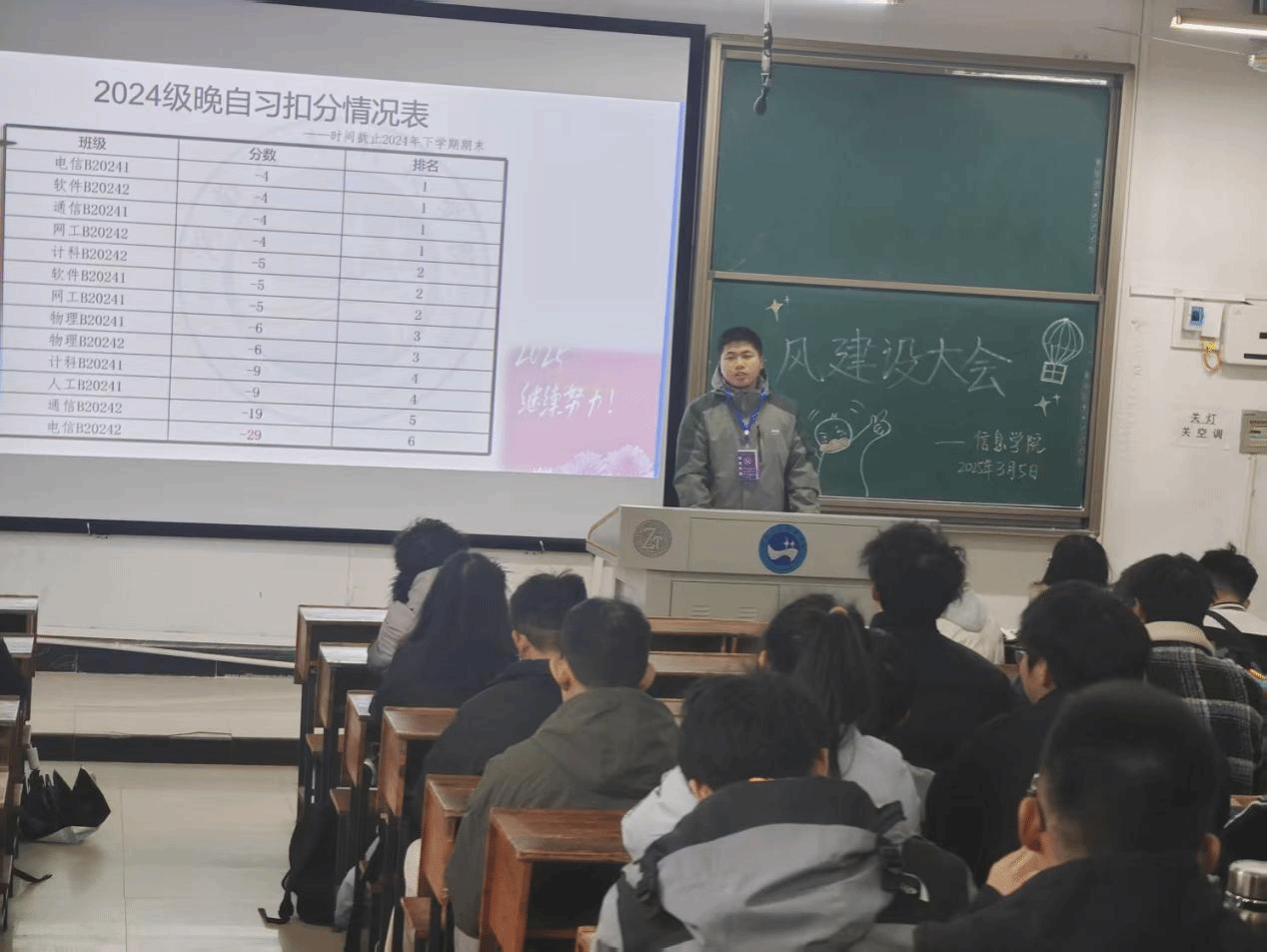 2025 年 3 月 5 日,信息学院于百全楼 103 召开本学期首次学风建设大会,聚焦学校本科评估、学风建设、安全教育三大关键工作。学院辅导员杨艺蕾、代鑫龙及全体在校班委代表参会,共商学院学风提升与发展路径。