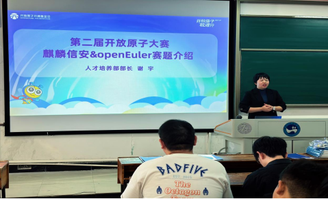 谢宇系统介绍了开源文化、openEuler开源社区、OpenEuler商业发行版-麒麟信安、信创人才需求及未来趋势等,并鼓励师生们积极加入开源建设。谢宇在宣讲中着重强调开放原子大赛的重要性和意义,她指出,本次赛事向所有的企事业开发者、高校师生和科研机构开放,也会有专业导师提供多方位的技术支持与指导,并希望师生们积极报名和踊跃参赛。