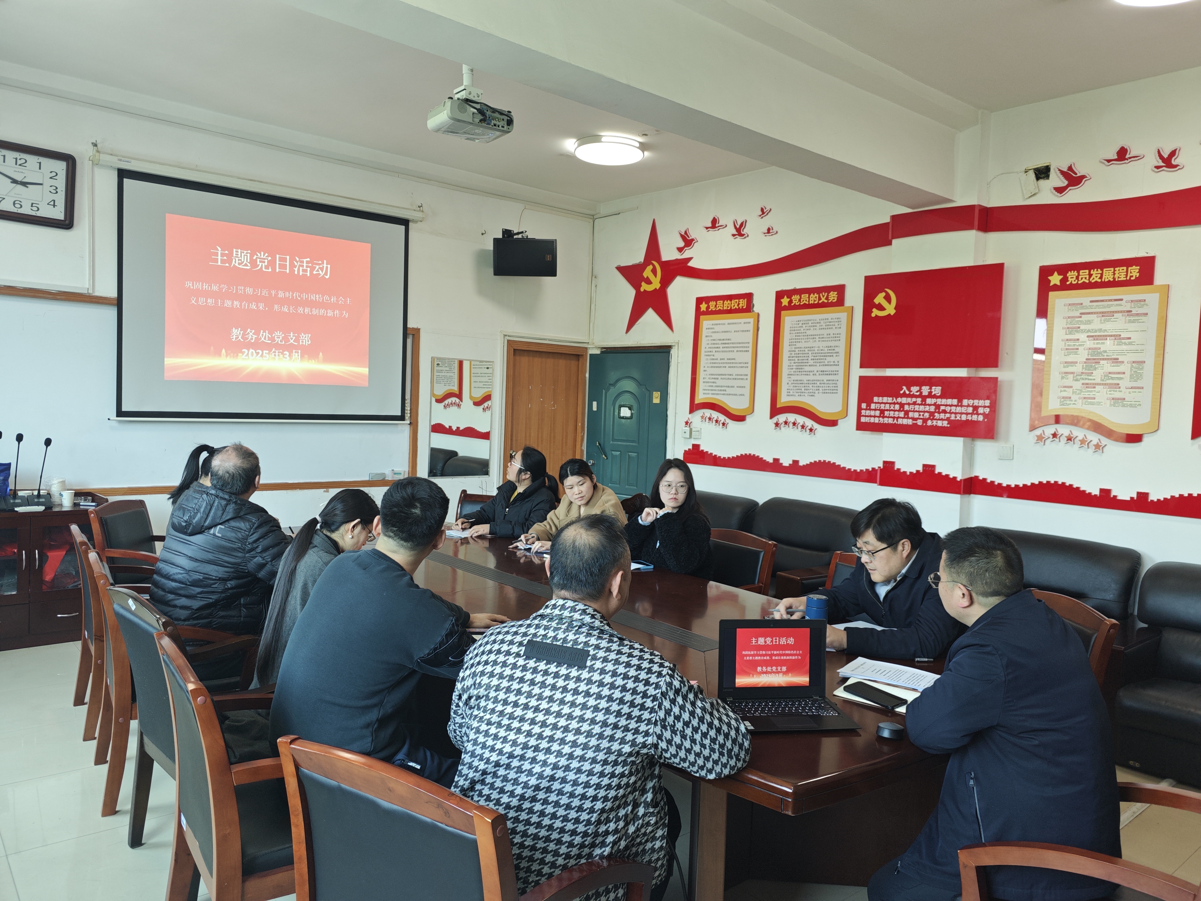 为深入贯彻落实党中央关于巩固拓展学习贯彻习近平新时代中国特色社会主义思想主题教育成果的决策部署,2025年3月19日,教务处党支部开展“巩固拓展学习贯彻习近平新时代中国特色社会主义思想主题教育成果,形成长效机制的新作为”主题党日活动。活动由教务处党支部书记刘浩主持,教务处全体党员积极参与。