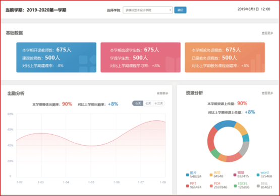 学期过程中一平三端全程记录学生端的学习数据教师端的教学数据,充分利用云计算、大数据、人工智能等新技术,构建全方位、全过程、全天候的支撑体系,助力教育教学、管理和服务的改革发展,为管理者考核提供有效依据。