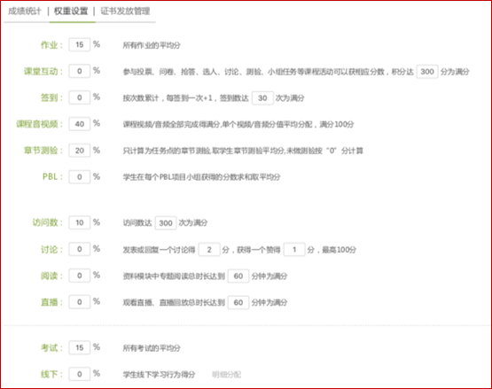 教师可自定义设置线上考核方式及权重比例,考核内容贯穿课前、课中、课后所有环节,做到形成性考核。