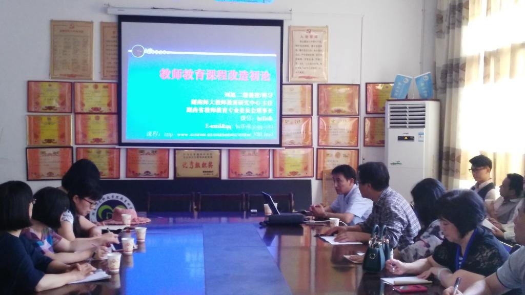 20175月18日下午3:00——5:50,湖南省教师教育专业委员会理事长、湖南师范大学博士导师、湘江学者刘旭教授,应邀来beat365在教育学院甘淑楼会议室做题“教师教育课程改造初论”的学术讲座。来自教育学院、学校各职能部门、兄弟学院的领导老师30余人参加了讲座。讲座由教育学院院长刘超良教授主持。