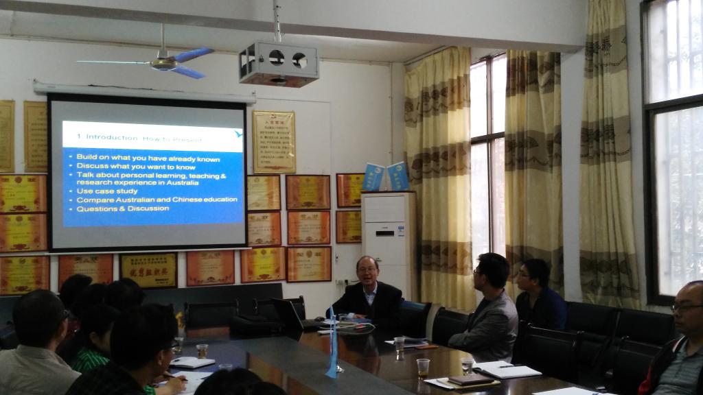20161018日(第八周,周二)下午3:00——5:00,在教育学院甘澍楼304会议室,学校国际交流与合作处、教育学院联合组织专题学术报告活动。主讲人位赵大成博士(中澳教育合作研发中心主任,西悉尼大学博士生导师,湖南省海外名师);讲座主题为:《国外大学教学及评价的理论与实践:澳大利亚案例研究》。会议由教育学院院长刘超良教授主持。与会人员主要有来自学校国际交流与合作处、研究生处、教育学院的领导和老师20余人。赵大成教授结合自己长期在国外的工作与科研教学经历,以澳大利亚高校为案例,生动风趣地介绍了国外大学教学及评价的理论与实践的主要特点与值得我国学习借鉴的经验,并与与会人员就感兴趣的问题进行了深入交流。讲座取得圆满成功。