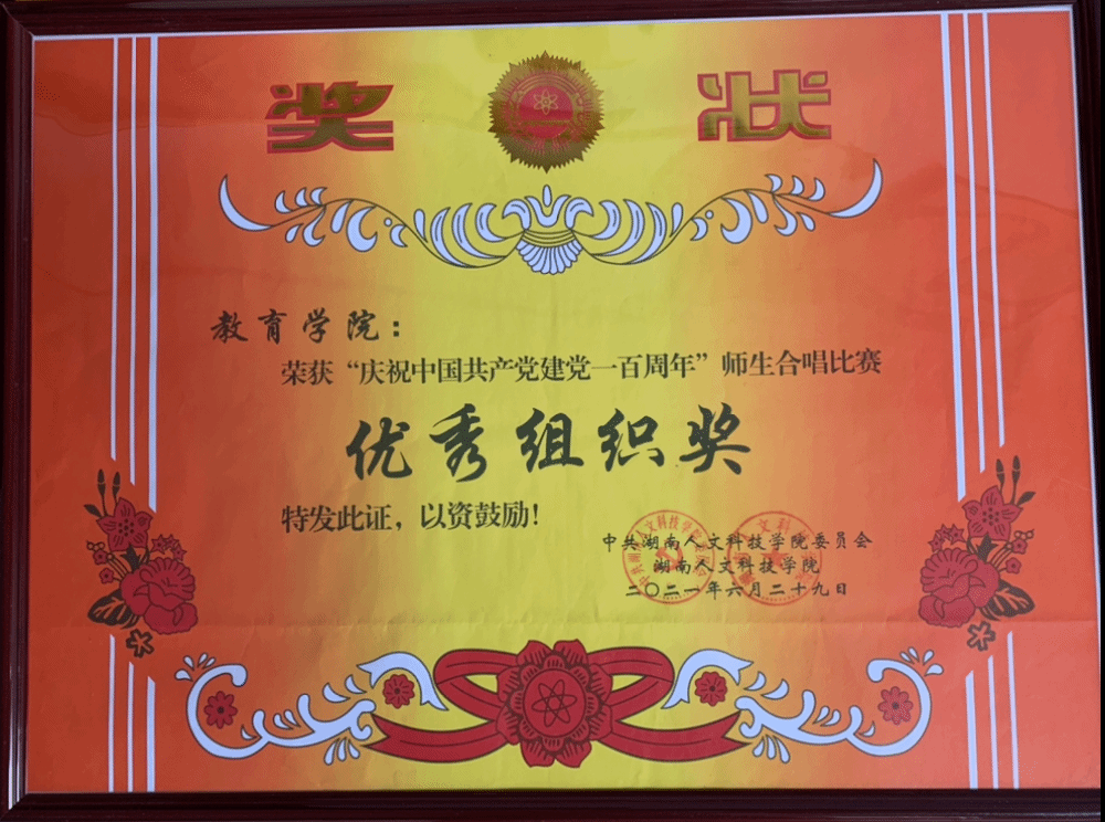 6月29日,在学校组织的庆祝中国共产党建党一百周年合唱比赛中,我院积极组织师生参赛,学院获得优秀组织奖。