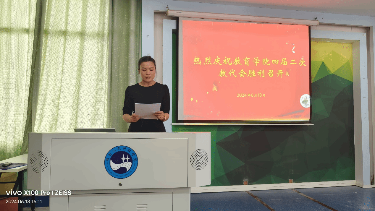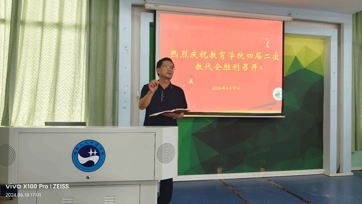 6月18日下午,教育学院在甘澍楼601召开“四届二次”教代会。会议由党总支书记陈功平主持,党总支副书记、院长蒋冰清、党总支副书记周卫军、副院长李国强,全体教职工、工会会员参加会议。