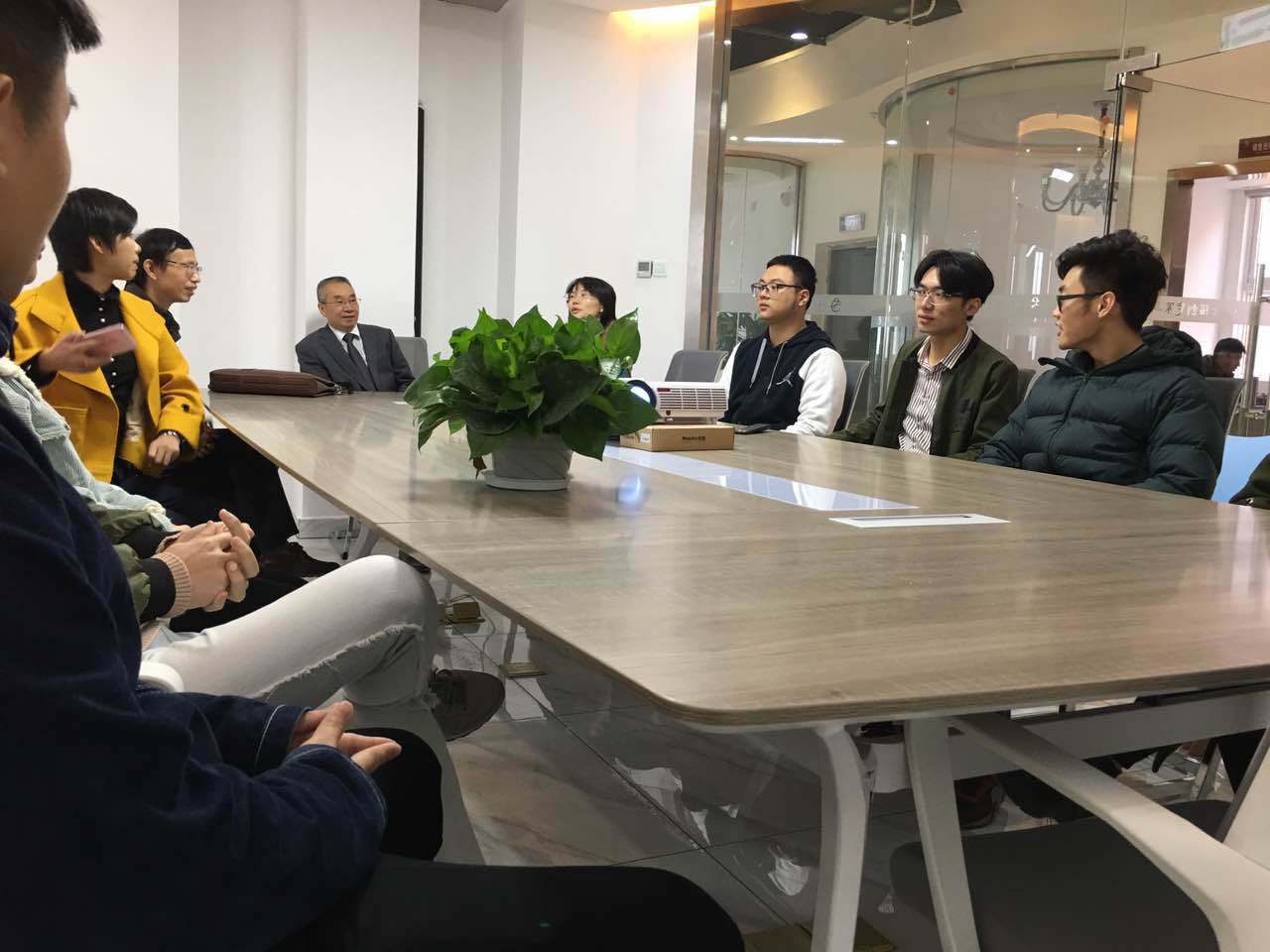 在考察过程中,公司胡总、苏总陪同三位老师参观了实习生的实习环境,并就毕业生实习和校企合作建立就业实习基地及公司发展问题进行了深入的探讨交流。之后,考察组老师和公司负责人、全体实习生进行座谈交流,实习带队老师苏小七简要介绍了每位实习生的实习情况,以及两个多月以来其各自的工作任务。实习生代表通过多媒体放映的方式,汇报了在七福公司实习的经历、收获及感想。