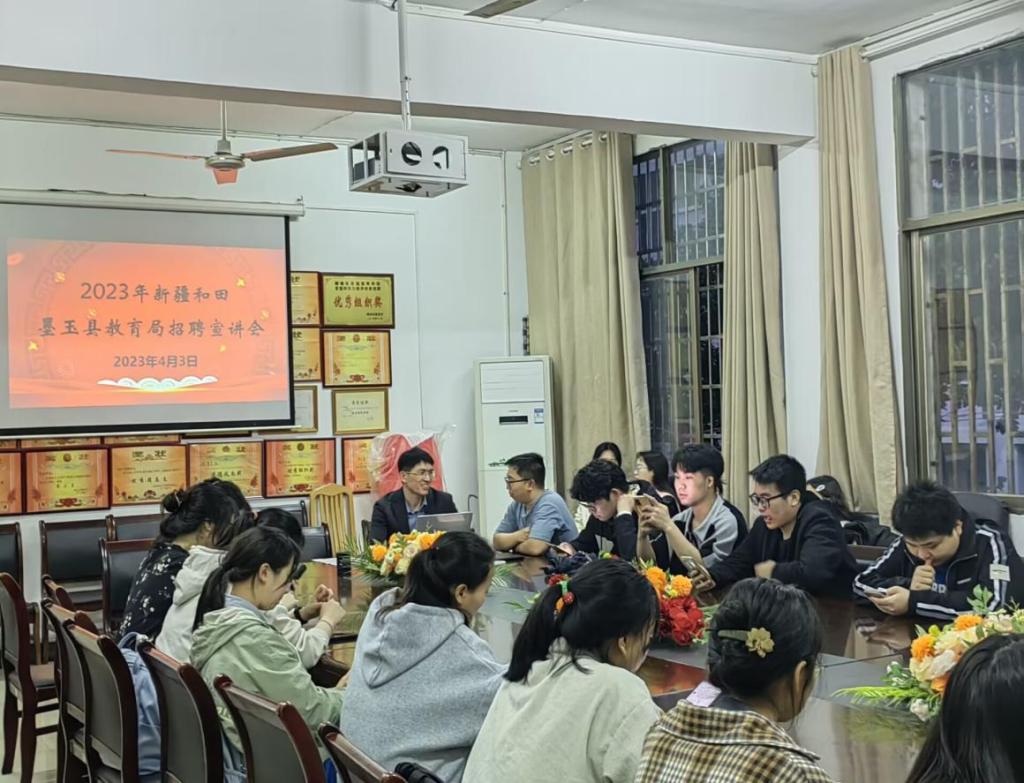 4月3日晚,2023年新疆和田墨玉县教育局招聘宣讲会于甘澍楼304举行。新疆和田墨玉县教育局招聘组曹龙云老师,教育学院党总支副书记田密,就业专干梁鑫,部分23届毕业生参加此次宣讲会。