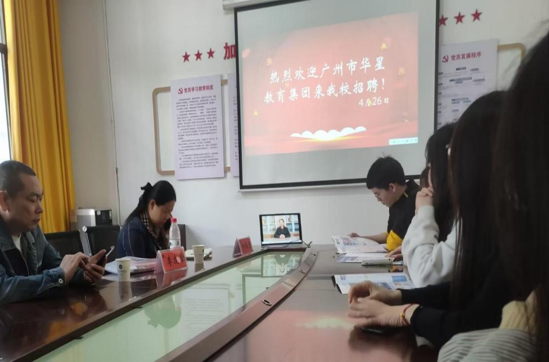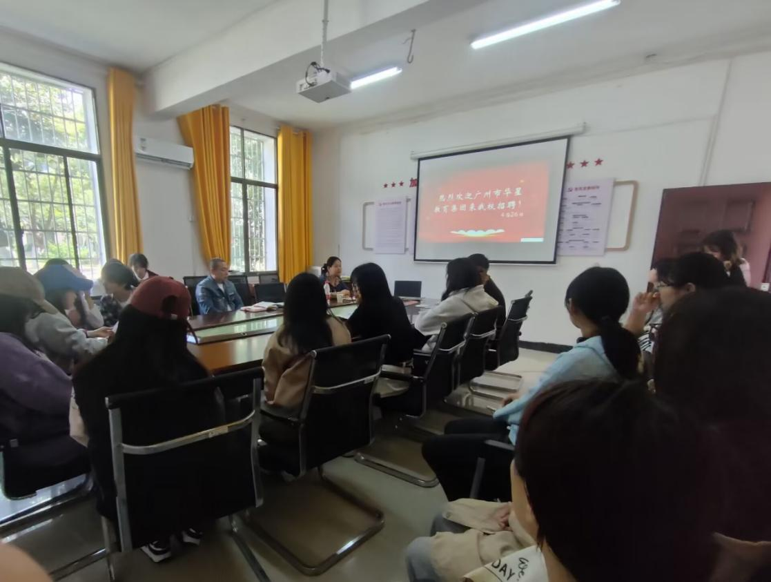 4月26日上午,2023年度广州市华星教育科技投资有限公司专场招聘宣讲会于甘澍楼204会议室举行。广州市华星教育集团副总经理郑俊芳、市场部经理李友章,教育学院就业专干梁鑫,部分19级学前教育专业学生参会。