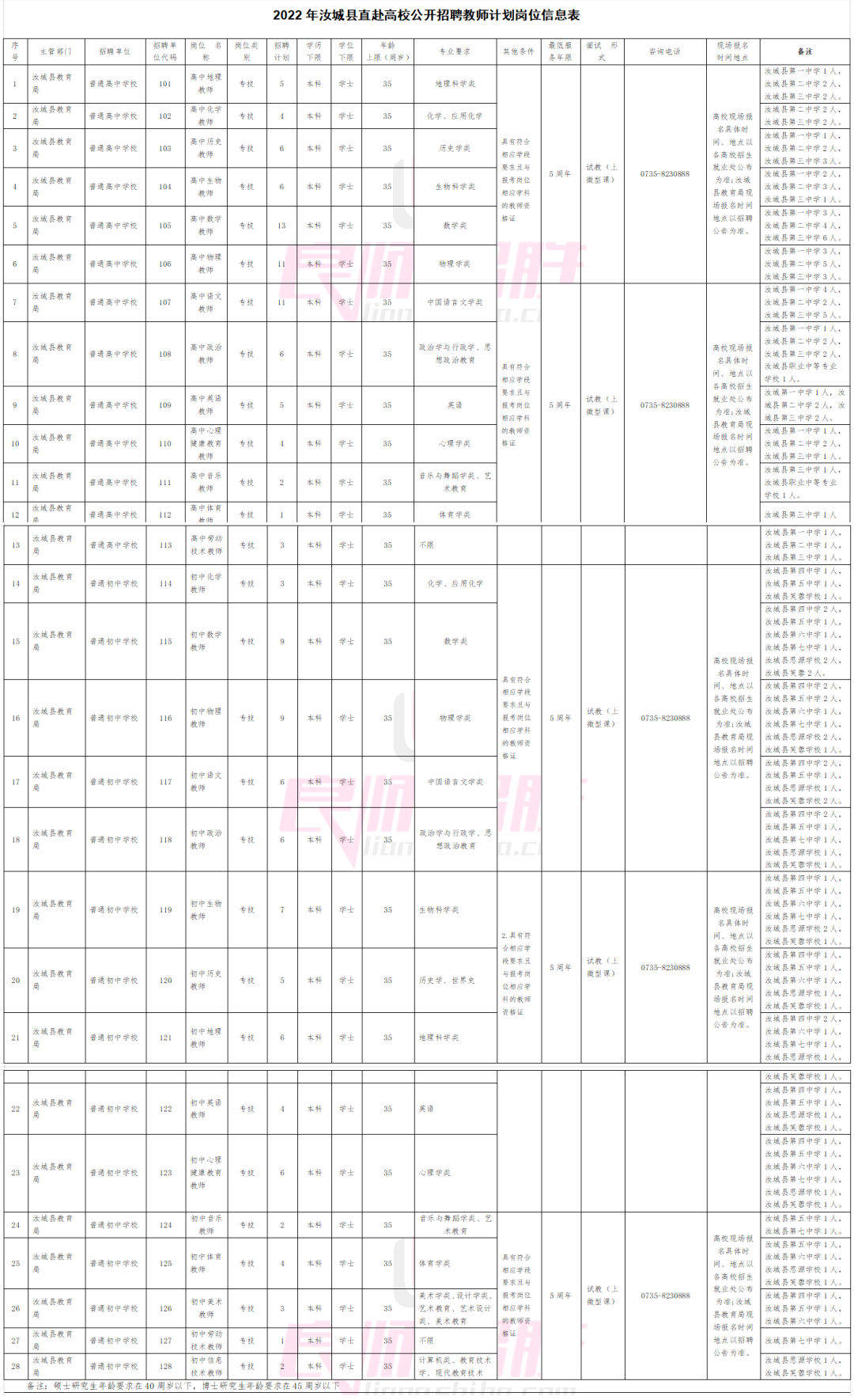 根据《事业单位人事管理条例》(国务院令第652号)、《关于进一步严格程序规范事业单位公开招聘工作的通知》(湘人社发〔2014〕34号)、省委组织部省人力资源和社会保障厅《转发中共中央组织部人力资源和社会保障部关于进一步做好艰苦边远地区县乡事业单位公开招聘工作的通知》(湘人社发〔2017〕5号)、《关于进一步改进事业单位公开招聘工作的实施意见》(郴组〔2016〕11号)和《湖南省事业单位公开招聘人员办法》(湘人社发〔2019〕1号)等文件精神,经研究,2022年汝城县直赴高校公开招聘教师150名,现公告如下: