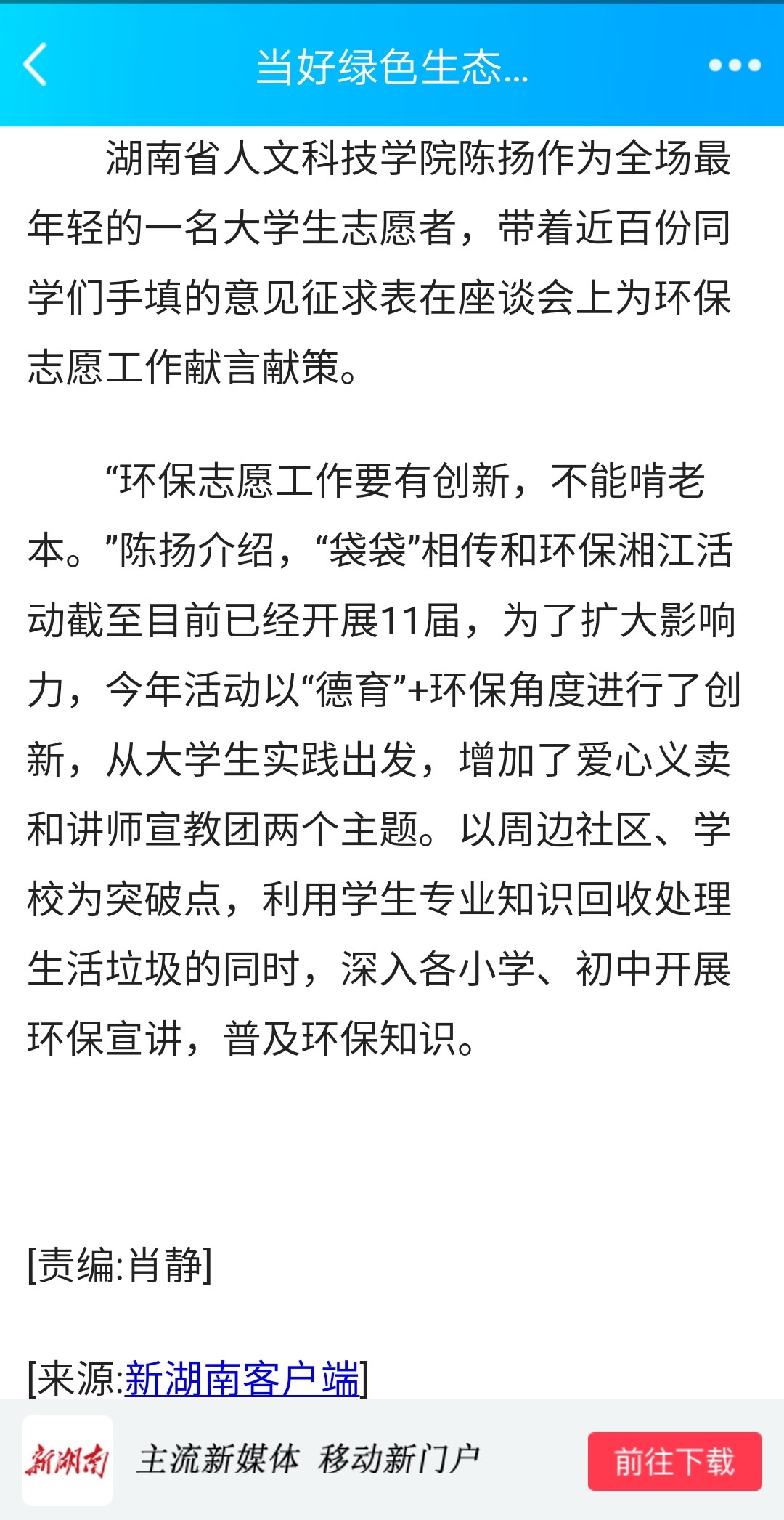 我院大学生代表陈扬是参会人员中唯一的一名大学生志愿者,他带着beat365近百份同学们手填的意见征求表在座谈会上为环保志愿工作献言献策。他在会上介绍了我院已经开展了十一届的“袋袋”相传和环保湘江志愿者活动,并表示会结合所学,为环保工作出智、出力者,做环保工作的传播者、记录者、践行者、监督者。