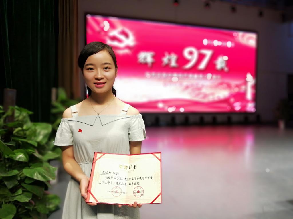 “湖南省普通高校百佳大学生党员”评选是学校根据中共湖南省委教育工作委员会《关于评选表彰2018年度湖南省普通高校百佳大学生党员的通知》要求,在十四个学院中开展了相关评选推荐工作,评选推荐了我院危佳艳同学参加湖南省评选并获得了此项殊荣。