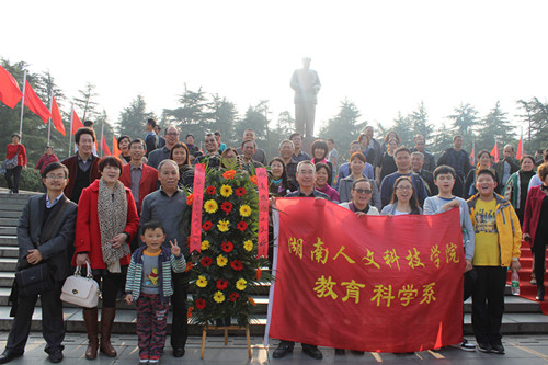 2014年11月22日上午,我系全体教师赴韶山进行参观学习。大家首先来到毛泽东广场,怀着崇敬的心情向毛泽东同志铜像敬献花篮,随后绕行一周,深情瞻仰毛泽东同志铜像。老师们还瞻仰了毛泽东故居,参观了毛泽东纪念园。晚上,观看了《中国出了个毛泽东》大型实景演出。该剧再现了毛主席为中国革命立下丰功伟业的一生,恢弘的场面和震撼的视觉效果令观众惊叹。
