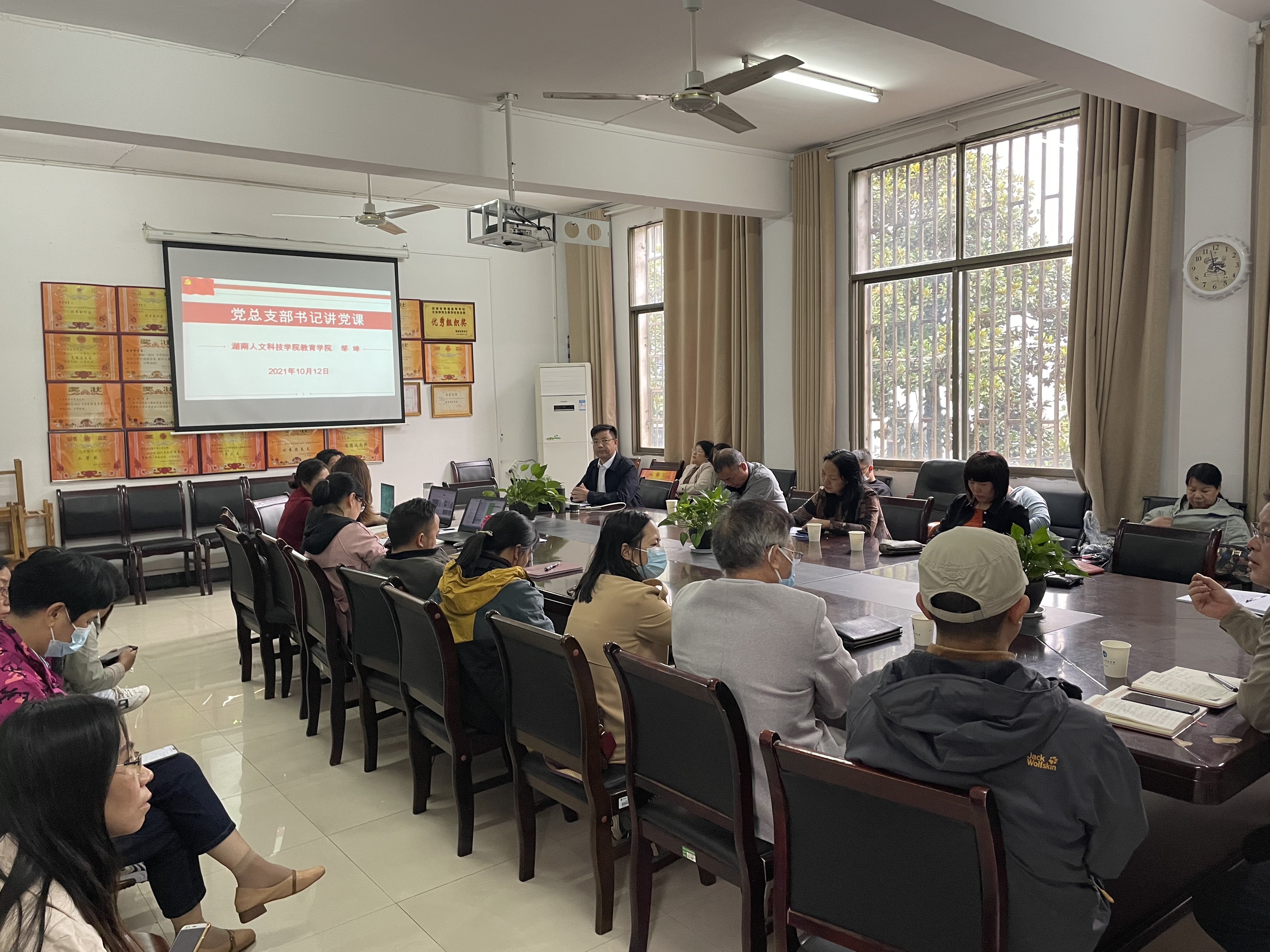 2021年10月12日下午2:30,教育学院党总支书记邹坤在甘澍楼304会议室开展“以十九大精神武装头脑 打好意识形态领域的阵地战”为主题的党课活动,活动由院长刘超良主持,全体教师党员参加,学院民主党派、无党派人士列席活动。