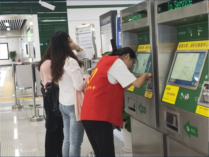 | 李岚作为地铁志愿者引导乘客出示健康码、核酸报告,帮助乘客购买车票 |