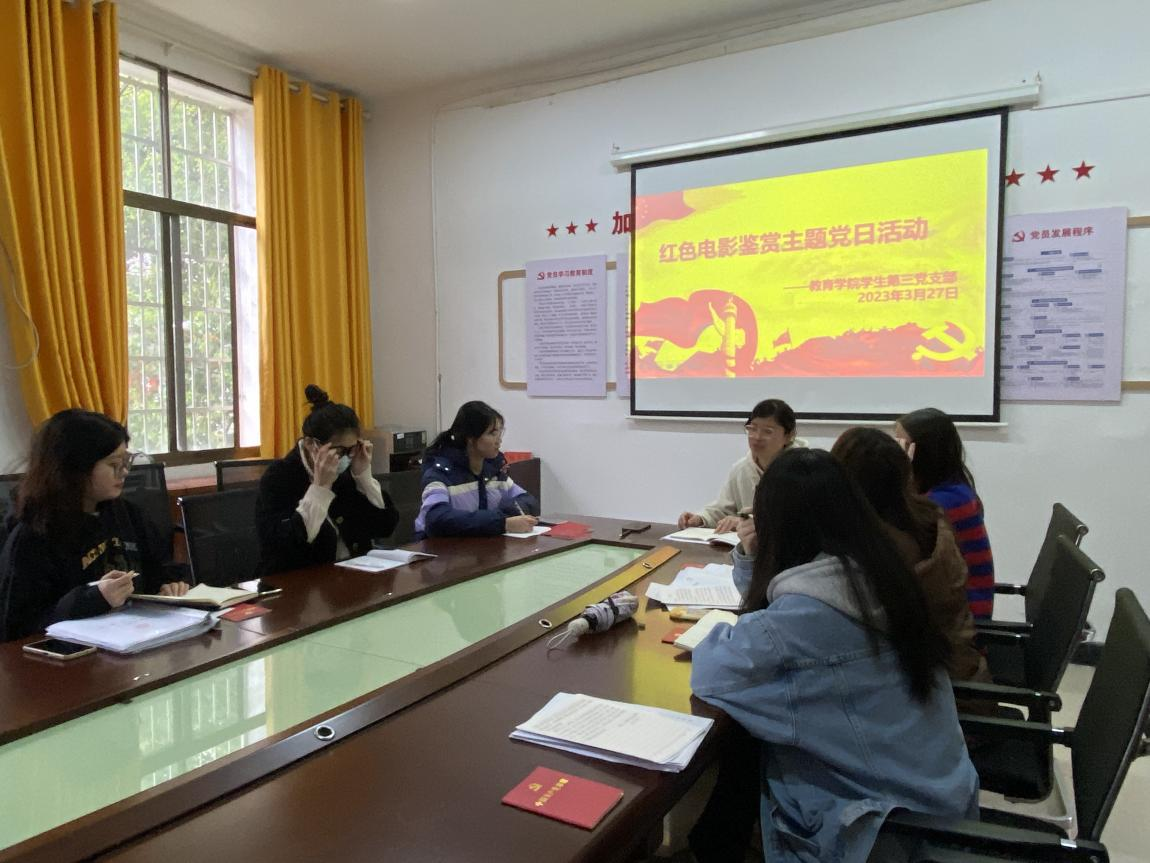 为了深切缅怀革命先辈,继承和发扬革命优良传统,弘扬爱国主义精神,培养学生党员勇敢克服困难的能力,坚定其理想信念,2023年3月27日上午,教育学院党总支学生第三党支部在甘澍楼党员活动室开展主题党日活动,支部书记杨维组织全体党员观看主旋律电影《长津湖之水门桥》。
