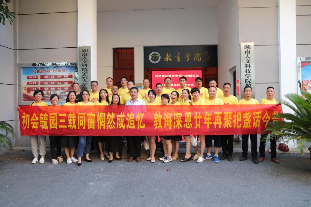 7月29日-30日,教育学院1999级校友毕业20周年回母校交流,为学校捐赠文化纪念石,并在图书馆一报告厅召开“二十年正青春,再聚首”同学座谈会。校长刘铁铭为文化纪念石题词“学而知道,教而成德”。校友办主任刘莉,教育学院党总支部书记邹坤、院长刘超良,原学院领导及班主任周月朗、吴智斌,校友代表40余人参加座谈。