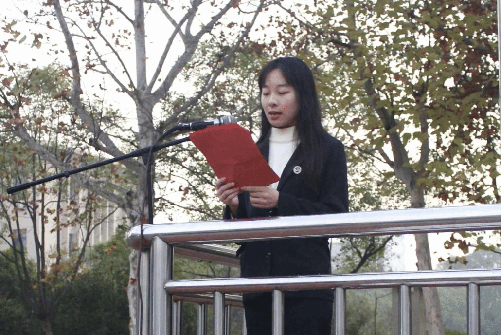国家奖学金获得者李康文代表学生做国旗下演讲,她从做好充分的课前预习、养成良好的学习习惯、培养广阔的学科交叉思维三个方面分享了学习心得。