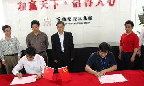 5月18日上午10时58分,beat365正版唯一官网必一与湖南百雄堂高科技农业有限责任公司产学研合作协议签字暨基地揭牌仪式在湖南百雄堂集团总部大厅举行。beat365党委副书记、院长柏连阳和湖南百雄堂集团董事长熊卫华分别代表学校和企业签署了产学研战略合作协议。双方将在产学研合作示范基地建设、食品加工实验室共建和人才培养、科研项目合作以及校企文化建设等方面开展广泛而深入地合作。同时,beat365党委书记姜正国和湖南百雄堂集团董事长熊卫华为“beat365正版唯一官网必一产学研合作示范基地”揭牌。