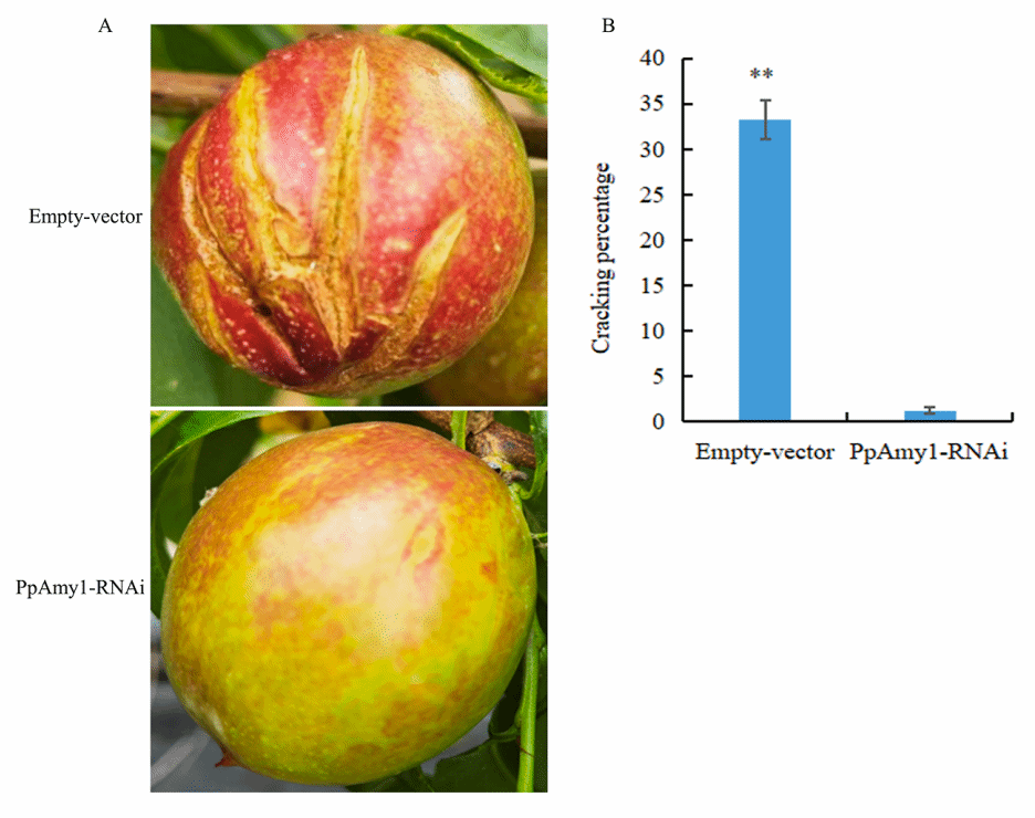图1 PpAmy1基因沉默对油桃裂果表型和裂果率的影响