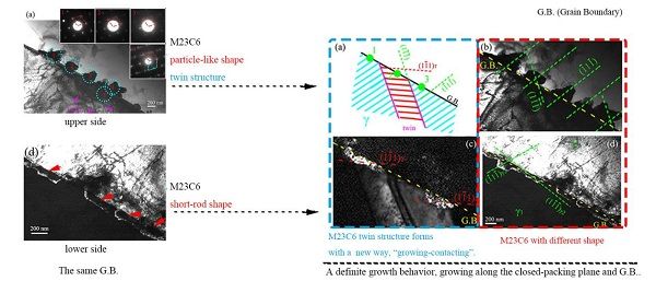 图1 Fe-15Mn-3Al-0.7C高锰TWIP钢晶界两侧形成不同形貌M23C6碳化物