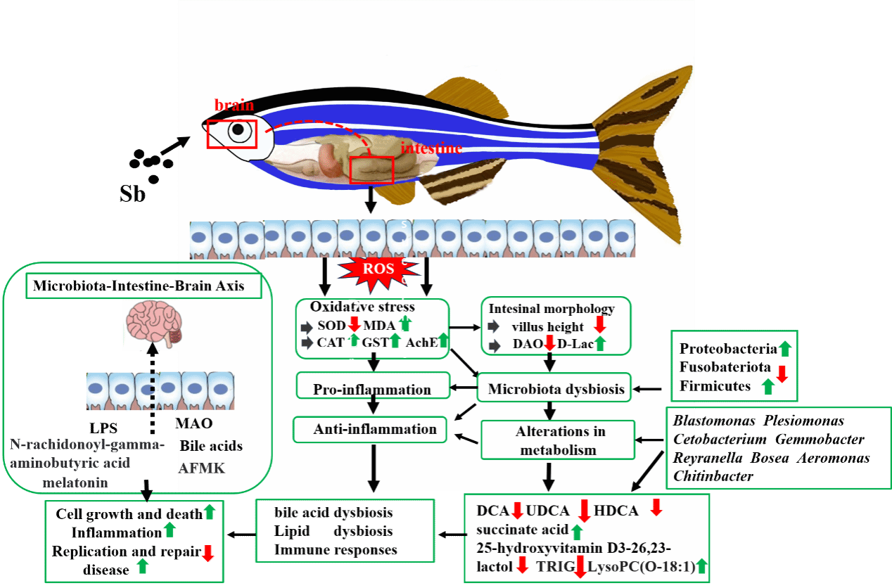 这项工作通过急性和不同环境剂量锑暴露的亚慢性实验,从不同环境剂量锑对斑马鱼的肠道毒性效应、 鱼体内 Sb 富集规律、组织形态学变化、 氧化应激和肠道微生态变化五大方面评价探究锑暴露对水生生物的肠道毒性效应与肠道微生态的影响。研究发现,成年斑马鱼肠道代谢物在暴露浓度仅为 30 µg/L 时已受到严重干扰,表明锑暴露显著影响代谢稳态,相关锑标准的制定应该基于肠道代谢变化方面去重新调整水生生物慢性锑暴露限值。去氧胆酸,胆固醇及其衍生物,磷脂酰乙醇胺等肠道代谢物含量的显著变化,进一步说明环境剂量锑暴露会引起肠道细菌氧化应激,导致炎症发生。熊去氧胆酸,三甲胺等脂质代谢物含量变化与其特定肠道菌属呈现出相关性表明斑马鱼肠道微生物菌群对肠道微生态的维持起到重要作用。同时,LPS、棕榈酰多巴胺、褪黑素等与脑神经调节相关的代谢物含量变化与其特定肠道微生物菌属呈现相关性表明肠道微生物菌群参与“微生物-肠-脑轴”调节。总之,环境剂量锑暴露对成年斑马鱼肠道毒性效应严重,可损坏肠道屏障,引发氧化应激,破坏肠道菌群动态平衡,导致肠道微生态失调,可能会通过“微生物-肠-脑轴”的复杂相互作用产生,最终可能导致肠道疾病的发生并影响到成年斑马鱼的脑部健康。该研究为湖南省非饮用地水源的锑标准工作制定提供了全面的落理论支撑。