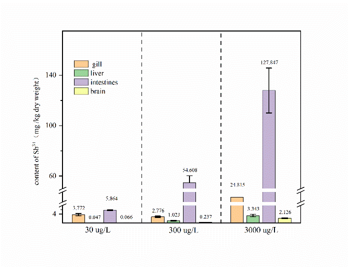 不同浓度锑暴露下斑马鱼各组织锑蓄积量及肠道组织损伤情况