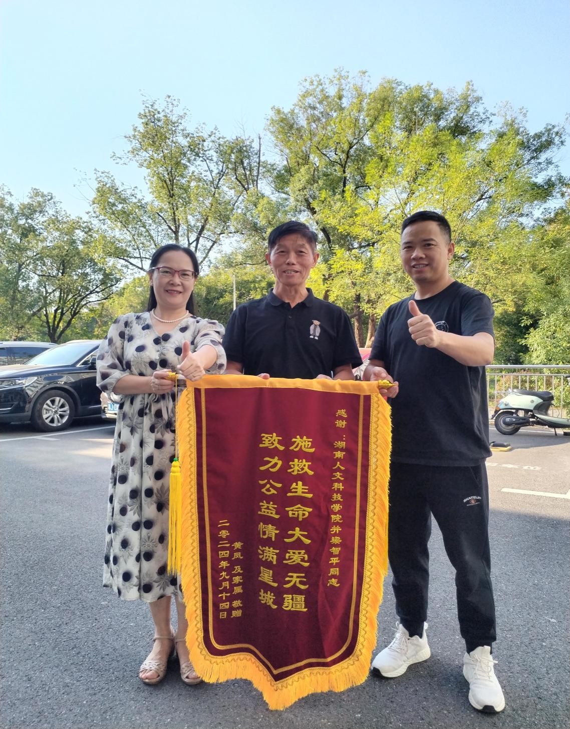 9月20日,当事人“凤飞翔”专程来到学校离退处为其送上锦旗,“施救生命大爱无疆  致力公益情满星城”,感谢梁老师的及时施救。