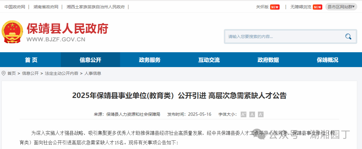为深入实施人才强县战略,吸引集聚更多优秀人才助推保靖县经济社会高质量发展,经中共保靖县委人才工作领导小组同意,保靖县事业单位(教育类)面向社会公开引进高层次急需紧缺人才15名。现将有关事项公告如下: