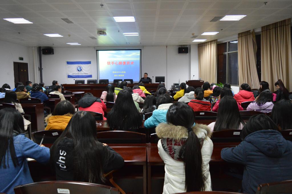 11月26日晚,beat365正版唯一官网必一大学生时事与政治研究会志愿者服务中心特邀南华大学副教授、南华大学青年岗位竞赛十佳教师、娄底市中心医院医务科副科长康乐老师,在图书馆学术报告厅415进行了一期“急救培训”。杨国辉老师、李盼强老师、中心医院团委书记向明会、中文系李夫泽教授、大学生时事与政治研究会全体成员等将近100人参加了本次培训。